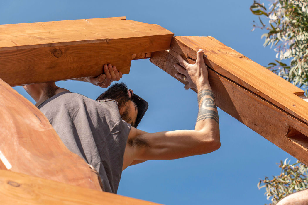 מבנה מעץ דאגלס פייר גושני בתוספת אלכסונים מעץ אקליפטוס. משתתפי הקורס בחרו את מתווה המבנה אשר בנוי מ 2 סגמנטים מרכזיים עם קורות קשר ואלכסונים. התלמידים בחרו ליישם מגוון רחב של מחברים אשר נלמדו במהלך הקורס.