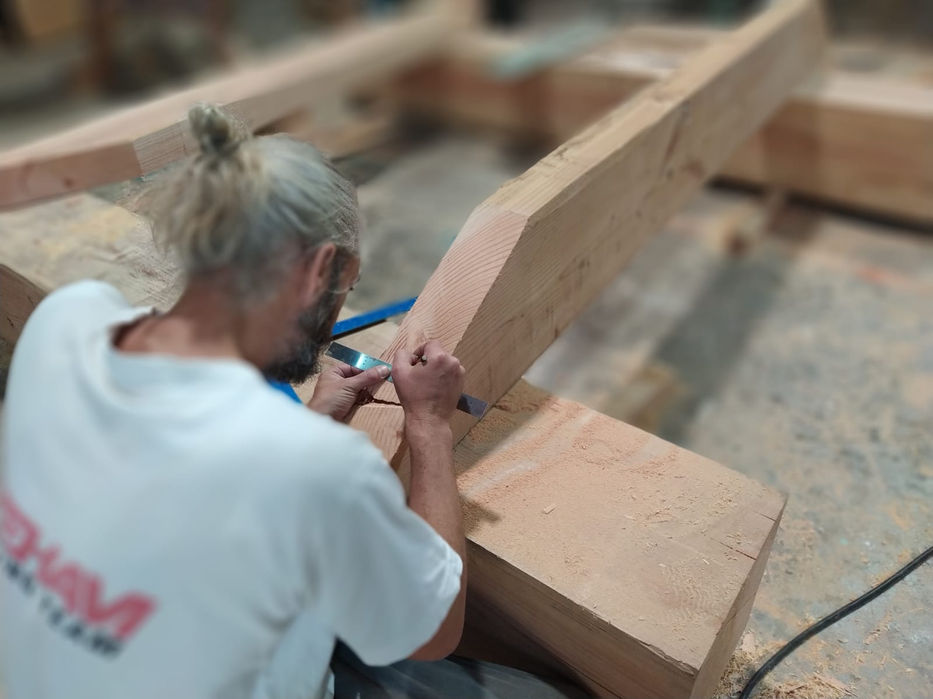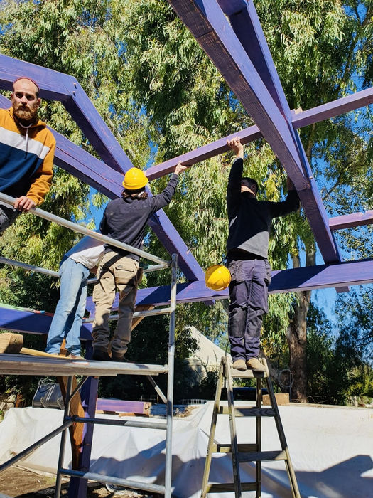 מבנה מעץ דאגלס פייר גושני בשילוב אלכסונים מעץ ברוש מקומי. משתתפי הקורס בחרו מבנה קלאסי של קורות נושאת, עמודים ואלכסונים. כאשר הגג בנוי מגיבלים מסורתיים המחוברים במחברי מתיחה. הצבע הוא חלק ממסורת ארוכת שנים שאנחנו המצאנו